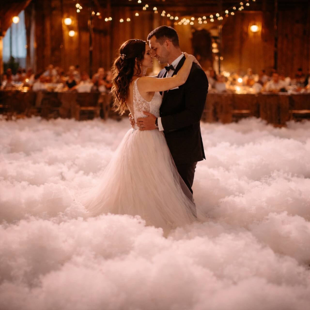 Efekt „tańca w chmurach” to jeden z najbardziej romantycznych momentów wesela. Nisko unosząca się mgła tworzy wyjątkowy klimat i sprawia, że pierwszy taniec nabiera magicznego charakteru.